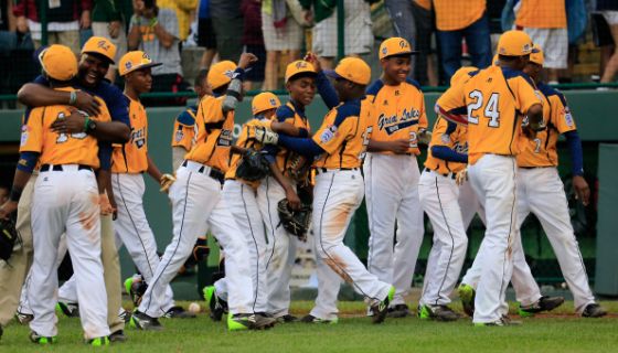 Members of the Great Lakes Team, Jackie Robinson West, from Chicago, celebrate following their 7-5 win over the West Team from Nevada during the United States Championship game of the Little League World Series on August 23, 2014 in South Williamsport, Pennsylvania. (Photo by Rob Carr/Getty Images)