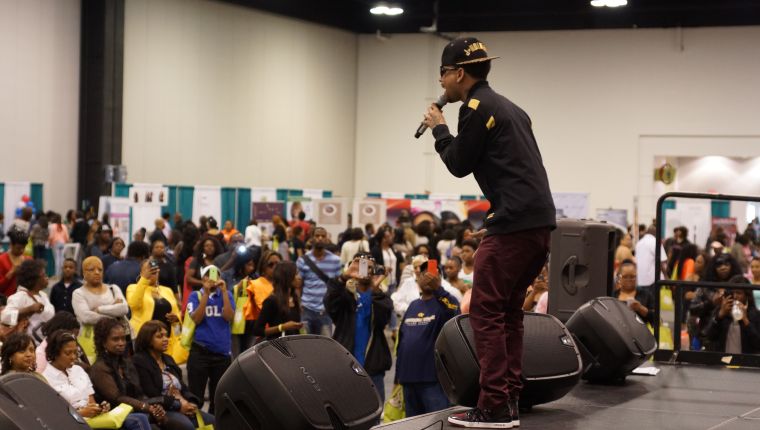 Junior from The Steve Harvey Morning Show takes a picture with a “Mind, Body & Soul” attendee